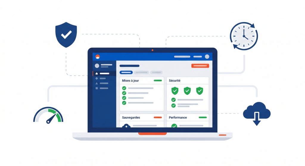 La maintenance de site internet regroupe l’ensemble des opérations qui assurent la sécurité, la performance et la visibilité en ligne de votre site dans la durée. C’est l’investissement le plus sous-estimé en développement web — et souvent le plus rentable.
